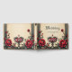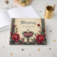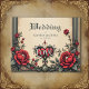 A gothic romance. An ornate, gothic-style frame surrounding a beige background. Red roses with dark green leaves are arranged around the frame, particularly in the corners. At the bottom centre, there is a decorative heart-shaped emblem with the word "LOVE" inscribed in a stylised font.