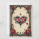 A gothic romance. An ornate, gothic-style frame surrounding a beige background. Red roses with dark green leaves are arranged around the frame, particularly in the corners. At the bottom centre, there is a decorative heart-shaped emblem with the word "LOVE" inscribed in a stylised font.