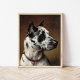 Carl Reichert’s A Great Dane is an elegant profile-view portrait of a striking black and white great dane set against a moody brown background. The painting captures the dog’s commanding presence and dignified expression, emphasising its sleek coat and powerful build. Reichert’s skilful use of light and texture highlights the noble character of the breed, creating a timeless and captivating portrayal of this majestic dog.