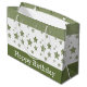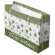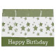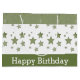 Star pattern in green large tote style paper gift bag, the happy birthday text can be changed to suit any special occasion, or text is removable, the white or the green stripes can be switched to any colour.