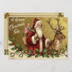 This vintage-style holiday card features a classic illustration of Santa Claus dressed in a traditional long red robe with white fur trim, carrying a sack overflowing with dolls and toys over his shoulder. He stands alongside a large reindeer, holding its leather bridle against a textured, gold-colored background. The scene is framed along the bottom by festive boughs of holly with red berries and mistletoe with white berries, while the greeting "A Happy Christmas Tide" appears in elegant white script on the upper left.