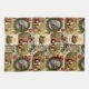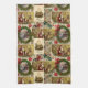 This design features a repeating Christmas pattern that looks like old-fashioned wrapping paper. It displays classic pictures of Santa Claus in his red suit standing next to a reindeer, along with large green holly wreaths tied with red ribbons that circle a snowy winter scene. The design is filled with traditional holiday details like lit candles, scrolls with greetings like "A Happy Christmas Tide," and warm colors that create a cozy and festive feeling.