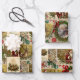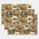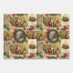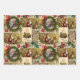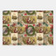 This design features a repeating Christmas pattern that looks like old-fashioned wrapping paper. It displays classic pictures of Santa Claus in his red suit standing next to a reindeer, along with large green holly wreaths tied with red ribbons that circle a snowy winter scene. The design is filled with traditional holiday details like lit candles, scrolls with greetings like "A Happy Christmas Tide," and warm colors that create a cozy and festive feeling.