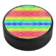 A hockey puck with a vibrant, symmetrical rainbow pattern on top, featuring a seamless mix of pastel colors. The setting is bright and colorful.
