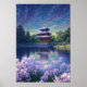 Experience the peacefulness of a Japanese temple nestled by a serene lake. The temple is surrounded by blooming pink flowers, with a lush green forest in the backdrop. Come and immerse yourself in the beauty of nature and find inner peace at this magical destination.
