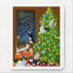 A detailed painting by Carolyn McFann of a family of cats playing around and in a Christmas tree during the holidays. Enlarge this design to see all the many details.