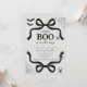 This design features Halloween baby shower theme "A Little Boo Is On The Way" with black bow and spooky spiders webs and spiders and flying bats to give it a cute but spooky Halloween vibe. Perfect for gender neutral baby shower in grey and black colours.