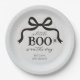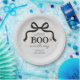 This design features Halloween baby shower theme "A Little Boo Is On The Way" with black bow and spooky spiders webs and spiders and flying bats to give it a cute but spooky Halloween vibe. Perfect for gender neutral baby shower in grey and black colours.