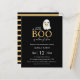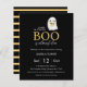 Simple and Modern Halloween Baby Shower paper invitation featuring a cute ghost holding a baby pumpkin on a black background. With the words " a little boo is almost due " and stripe pastel orange and black reverse. Ready for easy personalisation.