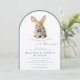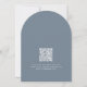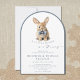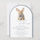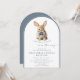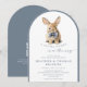 This elegant slate blue arched storybook Bunny Baby Shower Invitation features a watercolor illustration of a bunny wearing a blue bowtie, set within a modern arched frame. The design utilizes a muted slate blue and white color palette, combining elegant script with a mix of serif and sans-serif typography for a polished, boutique look. The arched frame and dusty blue hues create a timeless, elegant look. Personalize with your event details, and make gift-giving effortless with a QR code on the back linking directly to the baby registry. A beautiful and convenient way to invite loved ones to share in this special moment!
