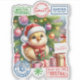 A cute, cartoon-like chick, wearing a Santa hat and red scarf, is standing next to a Christmas tree. The chick is holding a green gift with a red ribbon and bow. A cup of coffee and a stack of wrapped gifts are in the foreground.