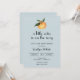 A little cutie is on the way! Send this adorable baby shower invitation to loved ones. Invitation features a watercolor, hand-painted clementine orange on a blue background. Personalise with your baby shower wording to celebrate the mummy to be.