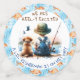 Baby Shower confetti. An adorable sweet little ai watercolor illustration of a baby boy fishing with a puppy dog. The colours of this invitations include blue and orange. Cute fish swimming around in the background.