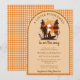 Designed in warm tones of burnt orange, soft tan, and rich brown, this baby shower invite is accented with a charming gingham border that adds a vintage, country-inspired touch. The peaceful lake scene, silhouetted trees, and glowing sunset make this invitation ideal for rustic, fishing, outdoorsy, cabin, lake house, woodland, or fall baby shower themes.