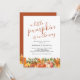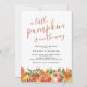 Rustic autumn baby shower invitations featuring a simple white background, elegant watercolor leaves and pumpkins, and a modern "a little pumpkin is on the way" template that is easy to personalise.