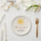 These sun-themed baby shower paper plates feature a cute yellow smiling sun and "a little ray of sunshine" in stylish script typography on a cream background.