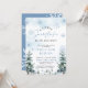 Baby shower invitation with blue snowflakes and pine trees, and boho design.