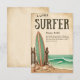 This vintage-inspired baby shower invitation features a rustic surf theme with a weathered beige background, a classic green-striped surfboard leaning against a wooden fence, and scattered seashells on the sandy shore. The scene is completed by turquoise ocean waves with a small surfboard riding the swell, evoking a nostalgic beachside charm. If you need any other matching product or customisation, kindly message via Zazzle.