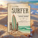 This vintage-inspired baby shower invitation features a rustic surf theme with a weathered beige background, a classic green-striped surfboard leaning against a wooden fence, and scattered seashells on the sandy shore. The scene is completed by turquoise ocean waves with a small surfboard riding the swell, evoking a nostalgic beachside charm. If you need any other matching product or customisation, kindly message via Zazzle.