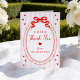 Express your appreciation with this sweetheart baby shower thank you card featuring “A Little Thank You” in handwritten red script on the front. The design showcases a hand-drawn scalloped oval frame topped with a red bow, set against soft pink and white stripes with scattered red heart accents. Personalized text on the front allows you to include your name for a coordinated look. The card opens to reveal space inside for your thank you message, making it easy to write a heartfelt note to guests after the celebration. Designed to coordinate seamlessly with sweetheart-themed baby shower invitations and stationery, this folded thank you card offers a polished and thoughtful finishing touch.