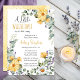 "A Little Wildflower Is On The Way" girl baby shower with daisies, seeded eucalyptus and lavender florals on front with a coordinating bouquet on a washed yellow watercolor background with sage green tiny polka dots. Perfect for celebrating your spring to early summer baby shower.