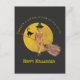 Cute Halloween altered art design features vintage school girl sitting on broom with witch's hat, black cat and golden full moon. Text : There's a little witch in all of us. Happy Halloween