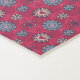 A long, rectangular piece of fabric with a repeating pattern of small, intricate floral designs in blue and pink on a deep red background.