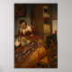 “A Maid Asleep” by Johannes Vermeer is a quiet, intimate scene set inside a warm Dutch interior. A young maid rests her head on her hand at a richly patterned table, momentarily drifting into sleep. Vermeer surrounds her with everyday details, a ceramic jug, fruit, and folded cloth, turning simple household objects into something quietly luxurious. Soft light spreads across the room, highlighting textures in fabric, wood, and skin while the open doorway adds depth and a sense of stillness beyond the moment. The result feels calm, human, and timeless, a perfect choice for anyone who loves classic genre painting, cozy interiors, and the subtle drama of light and silence.