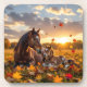 A pretty horse themed coaster. A beautiful scene of a mama horse and her baby foal sitting on the Autumn leaves at dusk.