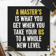 This bold typography design features the quote “A Master’s is what you get when you take your BS to a whole new level” in white and yellow text on a black background. The strong contrast makes the message easy to read and gives it a sharp, funny academic look. It is a great fit for master’s degree graduates, grad students, and anyone who enjoys witty school humor. The simple layout keeps the focus on the quote and makes the joke stand out clearly.