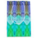 Decorative designed medium paper gift bag, tote bag style with handles, in fancy pattern in turquoise, teal, blue and purple, the 'Happy birthday' text can be changed to any message or text is removable.
