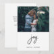 This ultra modern, minimalist holiday card says "joy" in handwritten black script on the front, along with your personal photo and your names for a simple and stylish Christmas greeting. You can add a personal message to the back, or delete the sample text for a blank card.
