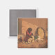 Vintage print of a monkey and a dog waiting outdoors, next to a wall where a large tambourine is leaning, near a door, with the monkey's hat on the ground. circa 1876