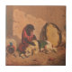 Vintage print of a monkey and a dog waiting outdoors, next to a wall where a large tambourine is leaning, near a door, with the monkey's hat on the ground. circa 1876