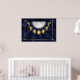 This sparkling design illustrates the lunar cycle in bright gold and deep blue. The jewels representing the moon phases run in a semi-circle from waxing crescent, to first quarter, waxing gibbous, full moon, waning gibbous, last quarter, and ending on a waning crescent. They are set against a fractal backdrop like the starry sky, with a silvery glowing moon photo from NASA to complete the piece.