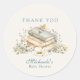 Blue storybook baby shower thank you sticker featuring a vintage book stack and soft watercolor florals creates a refined and meaningful finishing touch for a baby boy celebration. This literary themed baby shower favor label showcases delicately stacked antique books topped with a classic baby pacifier, symbolizing the beginning of a sweet new chapter. Soft blue typography pairs beautifully with the detailed botanical illustration, creating a cohesive and elegant aesthetic against the warm neutral background. The balanced combination of classic serif lettering and graceful script font delivers a polished, boutique inspired look perfect for a baby boy shower. Designed to coordinate seamlessly with invitations, welcome signs, favor tags, and décor from the same collection, this round thank you sticker adds sophistication to favor bags, gift wrapping, treat boxes, and envelope seals. Ideal for book themed baby showers, garden inspired celebrations, and rustic elegant party styling, this blue storybook baby shower sticker adds a thoughtful, coordinated detail guests will truly appreciate.