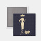 A stylish womans silhouette in mid century fashion with her pekingese layered on french script.