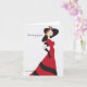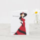 Girl in a red dress with black triming, black long gloves and wearing a black hat with a red bow.