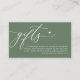 Celebrate the beginning of your journey together with our elegantly crafted "gifts" wedding invitation enclosed card in sage green theme. Featuring a sophisticated blend of modern script and romantic allure, each card is meticulously designed to convey the essence of your special day. Perfectly suited for couples seeking a unique way to share their honeymoon dreams, wishing well, cash, this card invites your loved ones to contribute towards unforgettable experiences. Whether nestled in a luxurious envelope or presented alongside your wedding invitations, our card adds a touch of enchantment to your celebration, promising cherished memories that last a lifetime. Designed by TeeshaDerrick.