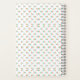 A notebook with a spiral binding features a white cover adorned with small, colorful geometric patterns. The vibrant design adds a playful and artistic feel.
