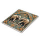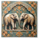 Two elephants stand side by side, their trunks intertwined, in front of a stylized tree with orange flowers. The elephants are decorated with similar floral patterns in shades of orange and gold. The background is a mosaic of blue tiles, with an archway above the elephants also adorned with orange flowers and foliage.