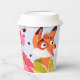 A paper cup with the character red fox in it looks at a bird. The fox is holding a cup of coffee. The illustration is in a flat style in pink and green and blue shades.