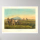 The Bancroft Library Presents: Two trappers dressed in buckskin stand beside horses, rifles drawn, behind pack mules, as third trapper rides up to great Indian on horseback; group of Indians on horseback in distance. Plains setting with flowering cacti to right. By John Cameron in 1866.
