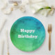 Teal, and green paper plates, happy birthday themed text can be personalised to any special event.