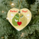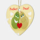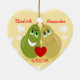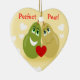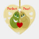 This adorable ornament for couples is a great way to commemorate a couples first Christmas together, an anniversary or wedding! Design features a pale yellow background with white hearts. There are two pears in different shades of green. These two pears are leaning on each other and have big smiles on the their cute cartoon like faces. There is a red heart front and centre of this perfect pair of pears! There is text in red font on the front that says Perfect Pear! The reverse side has the same design. There is text in red font for the couples name and on the bottom a spot for the couples wedding / anniversary date. This ornament makes a great Christmas gift for a new couple, a wedding gift for a newly married couple or an anniversary gift for a married couple!