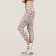 A person wearing colourful, patterned leggings stands facing forward. The leggings feature swirling pink, green, and blue designs. They wear white sneakers.
