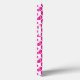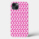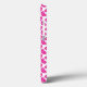 The design appears to be a repeating pattern consisting of a pink and white colour scheme. The pattern features an array of abstract shapes that resemble paisley designs, commonly found in textiles. Each individual shape is pink with a white outline and contains smaller white decorative elements inside. These shapes are arranged in a diagonal orientation, creating rows that alternate direction, which adds to the visual interest of the pattern. This type of design is often used in fabrics or wallpapers and is interesting due to its intricate details and the way the shapes interlock to form a continuous, flowing design.