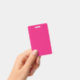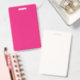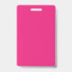 a pink background with a black border ID badge