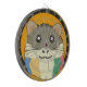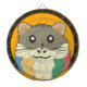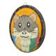 A cute cartoon hamster with a multicolored scarf is surrounded by a bold black circle centred within a circular golden background. The minimalist style and playful expression of the hamster give it a cheerful and lighthearted feel.
