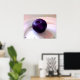 A purple plum, a ripe plum, a shiny plum is the subject of this original photograph. We see the round fruit as it sits on the curves of a white plate, throwing its oval shadow in pastel colors across the dish which sits on a textured pastel background. This closeup photo of a plum shows off the plum's curves around the top with a highlight in a light cobalt blue color. Almost taking center stage on the light background, this richly dark colored plum is the star of the show, delicious! Spread out across the bottom of the plum photo print, there is black text which reads "PLUM". This is set to personalize or delete as you wish. Enjoy the beauty of fresh fruit anytime with this poster.